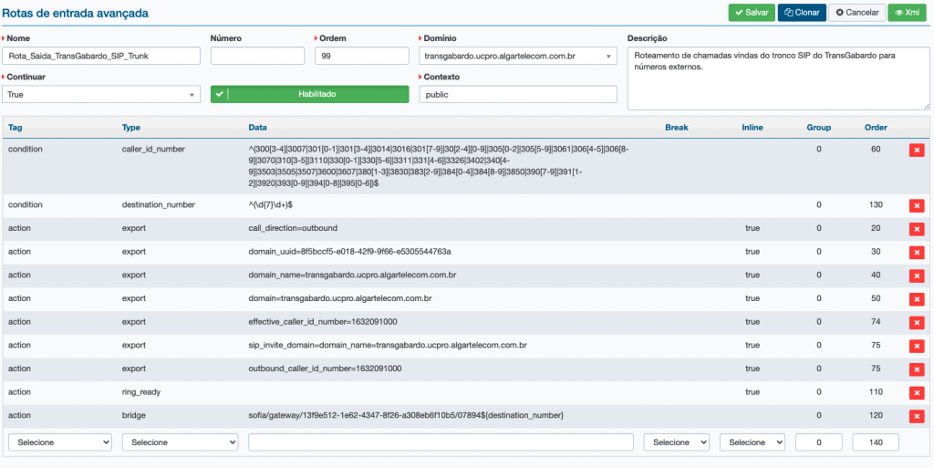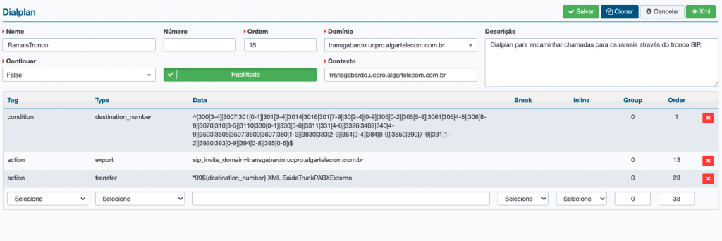 - Dialplan para processar chamadas de saída para os números através do SIP Trunk.